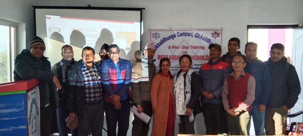 On December 1, 2023, Okhaldhunga Campus organized a five-day training on Research Methodology in Okhaldhunga Campus, Okhaldhunga. Facilitated by Mr. Yubraj Dahal, Mr. Ramesh Kandel, Mr. Badri Prasad Dhamala, Mr. Bheshnath Khanal, Mr. Somnath Poudel, and Mr. Choplal Dhamala, the event aimed to enhance the learning experience. Participants, including dedicated faculty and non-teaching staff from Okhaldhunga Campus, enthusiastically delved into the exploration of research methodologies. Throughout the five days, the event promised to provide valuable insights into research methodology, fostering a culture of continuous learning and academic excellence.