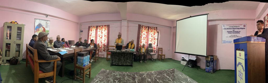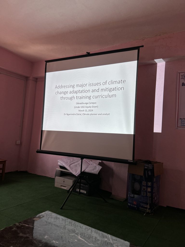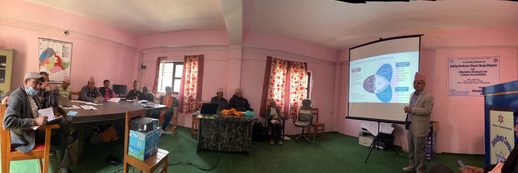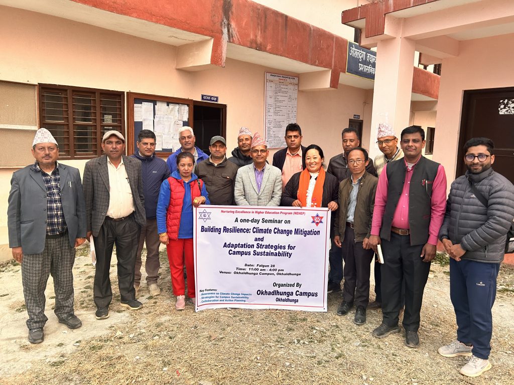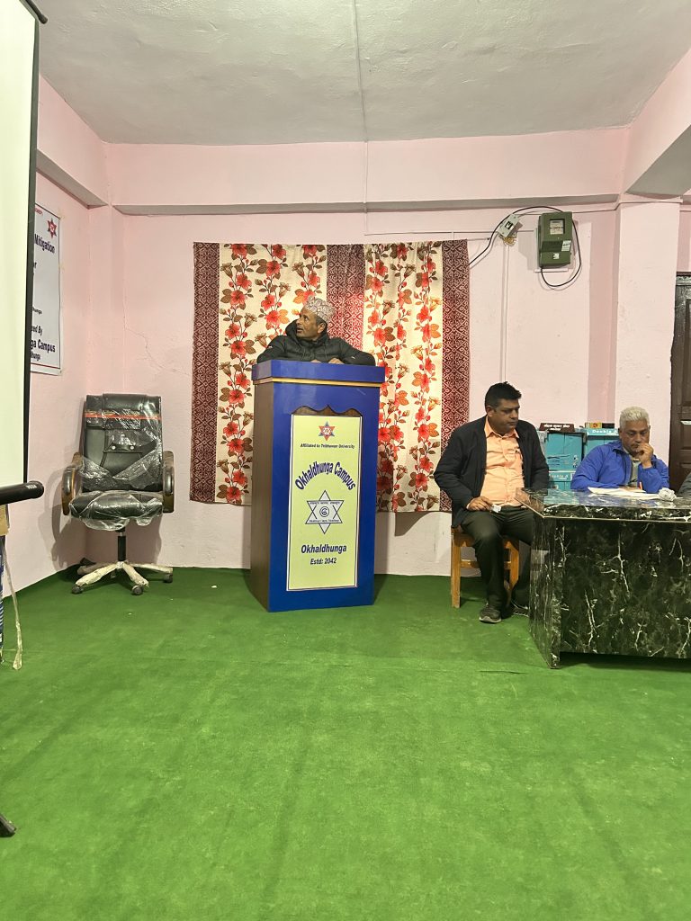 Okhaldhunga Campus held a “Building Resilience: Climate Change Solutions” seminar on March 11, 2024. The event aimed to tackle environmental issues and promote sustainability. Attendees included faculties, staff, and CMC members. Dr. Nagendra Dahal, a renowned expert in environmental science, led the seminar.